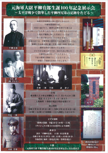 平柳四兄弟(誠、三郎、育郎、芳郎)はいずれも浦中出身ですが、中でも三男の育郎氏は、当時の浦中校長今井精一先生が「天下に誇る英才」と称し、進学した海軍兵学校では「開校以来の秀才」と謳われ四年間主席でした。人格的にも大変優れ、兵学校の教官からは「得行顔回(孔子の最高弟子)を想う」と讃えられました。