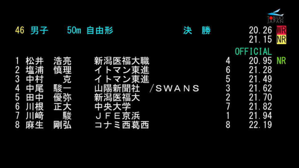 高64卒の松井浩亮さんが、10/26に開催された水泳日本選手権(短水路)の50メートル自由形で、日本新記録で優勝しました。おめでとうございます。来年の東京五輪の有力候補に躍り出ました。